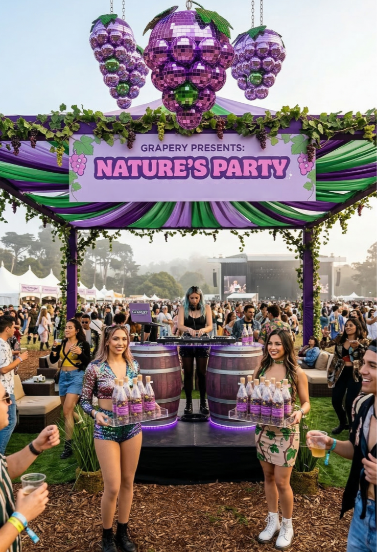 The Grapery pop-up brings a DJ, bottle girls serving up free grapes, and a Grapery branded totem.