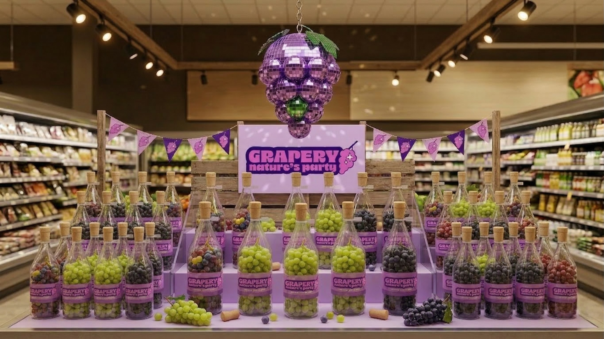 Grapery’s revamp of the produce aisle showcases their updated packaging under the glow of grape disco balls.