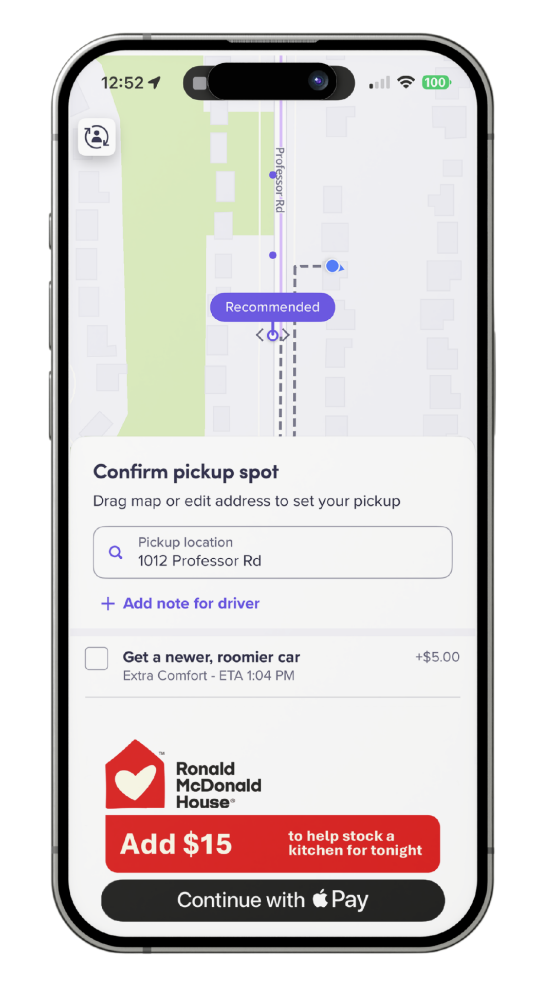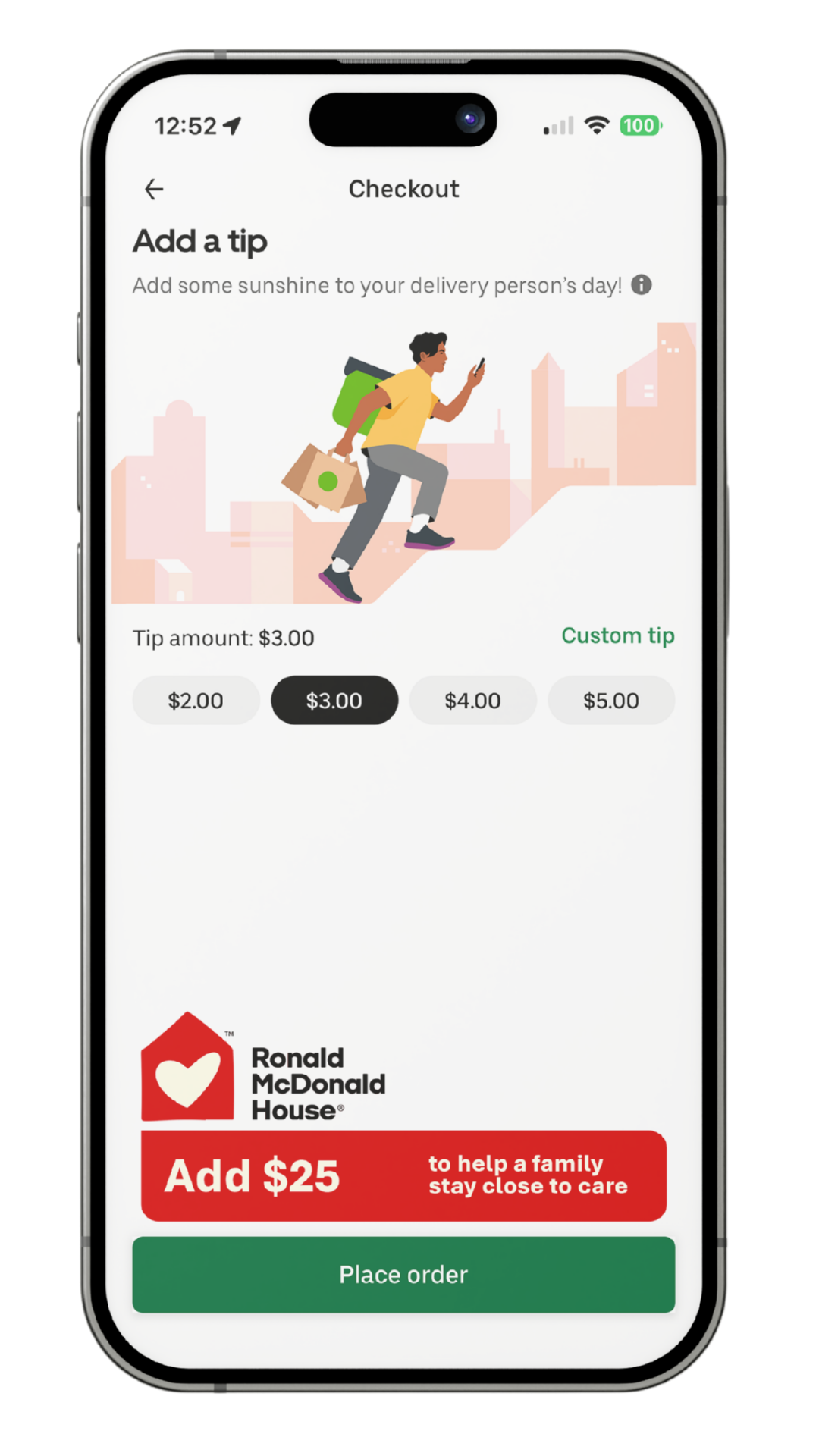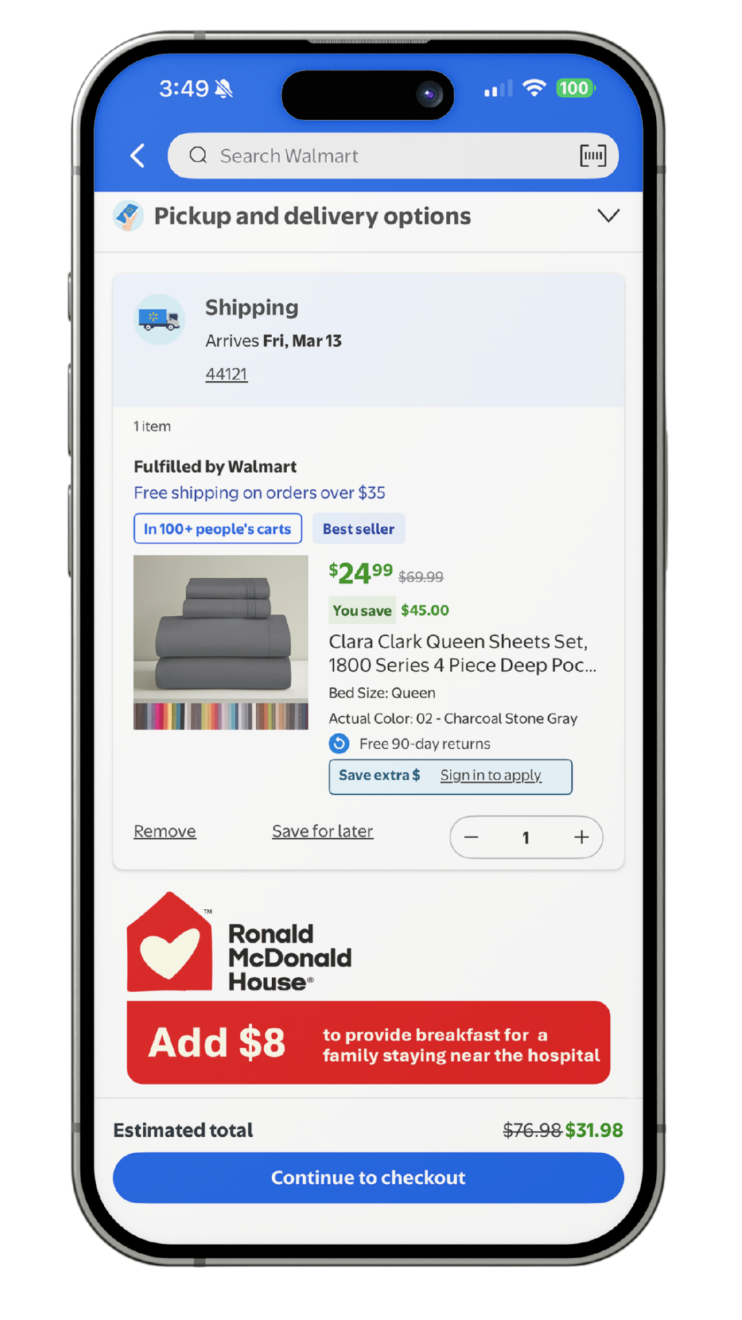 At checkout on participating e-commerce, food delivery, and ticketing platforms, users see a simple Add to Care prompt that translates a small donation into specific support for a Ronald McDonald House family.