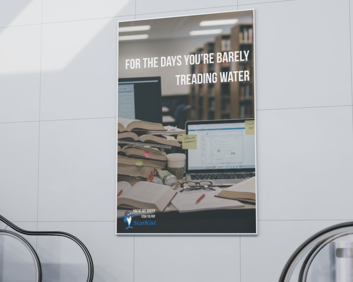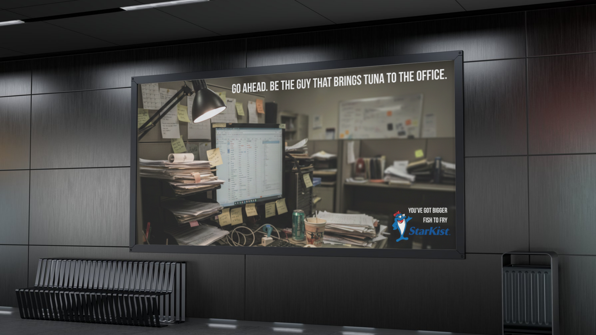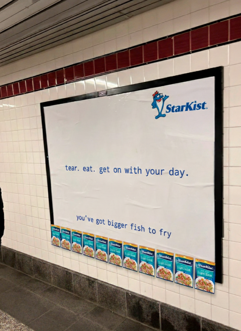 That’s why Starkist is installing large format exaggerated tear-off flyers within public transportation hubs in major cities to encourage sampling and generate buzz. The tear-off tabs are actual Starkist pouches that you can tear off, open, and eat on the go. Because after all, you’ve got bigger fish to fry.