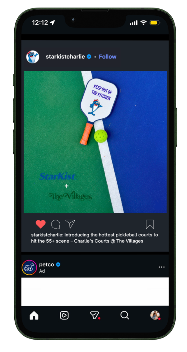 With the Starkist pouches painted on the court and branded equipment, residents are reminded that Starkist helps keep them out of the kitchen and tending to their busy social lives instead. Armed with quick, easy, portable, and mess free protein on the go, everyone’s a winner on Charlie’s Courts. Because after all, you’ve got bigger fish to fry.